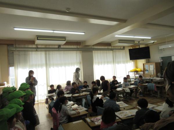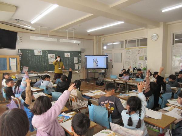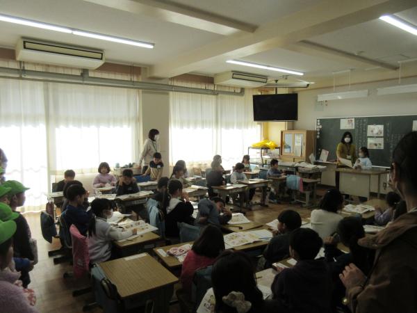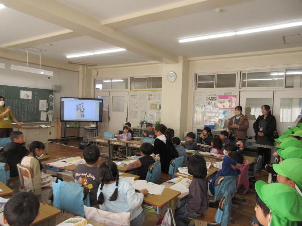 友だちと意見を出し合いながら、「みんなが使うものは大切に使う」ことについて考えました。 すみれ幼稚園の年長さんも授業を見学に来てくれ、1年生は進んで発表する姿を見せていました。 最後は、幼稚園生も笑顔であいさつをし、温かな交流となりました。