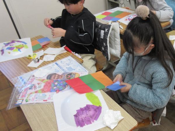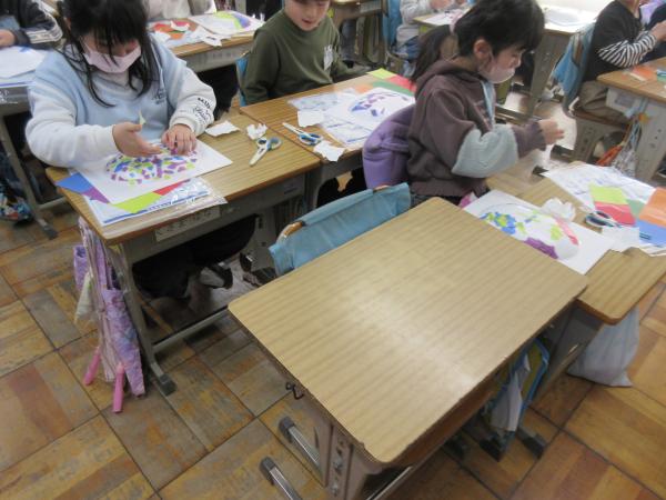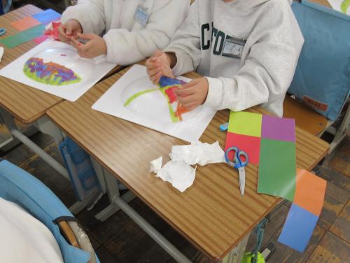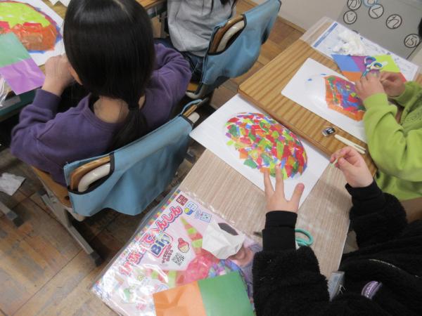 2年生は、図工の学習を楽しみながら取り組んでいます。 色紙の色や形を工夫しながら、世界に一つだけのお面づくりをしています。 完成は来週を予定しています。