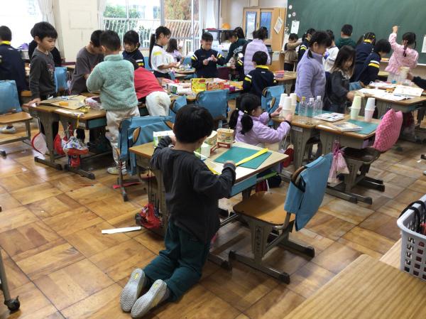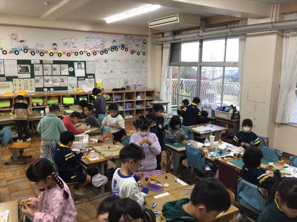 今日は、校庭で見つけた秋のもので、どんぐりごま、アクセサリー、迷路、けん玉などを作りました。グループで協力して頑張っていました。