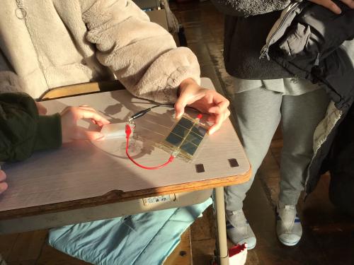 光電池に電子オルゴールをつないで音を鳴らしていました。