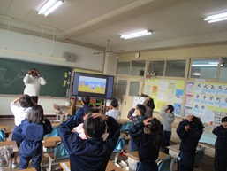 今日の様子です。歌に合わせて体を動かし、体の部位を英語で復唱しています。