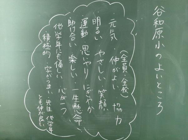 本日6年生の道徳では、『谷和原小学校にどんな心を残したいか』を考えました。 児童からは、 ・優しい心 ・助け合いの心 ・やってみようの心 ・高学年も低学年も仲良くする心 など、谷和原小学校の良いところを引き継ぎたい気持ちがよく出ていました。 6年生の皆さん、谷和原小学校によい伝統を残せるように頑張っていきましょう!