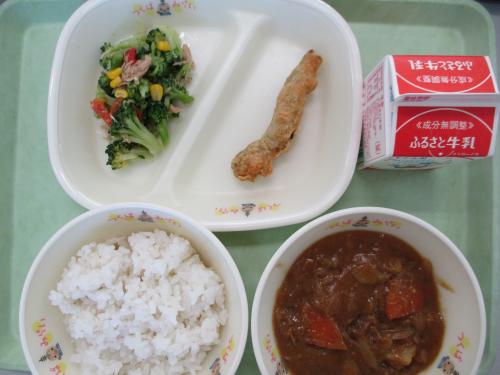 《こんだて》金芽米ごはん 牛乳 子持ちししゃもフリッター ブロッコリーと赤ピーマンのマリネ チキンカレー 今日の給食は「チキンカレー」のこんだてです。準備をしている時から「カレーのにおいがする~!」と、うれしそうにしていました。
