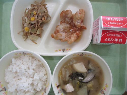 《こんだて》金芽米ごはん 牛乳 鶏肉のレモン煮 鶏肉のレモン煮 ごぼうとキャベツのサラダ じゃが芋のみそ汁 今日の給食は、大人気の鶏肉のレモン煮のこんだてです。こんだて予定表を見て、今日の給食を楽しみにしていた児童がたくさんいました。レシピは市公式クックパッドにのっていますので、ぜひご覧ください。
