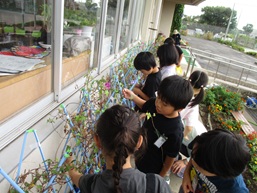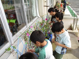 あさがおの観察をしました。花がたくさん咲いている子や、花が咲き終わり、たねを収穫できた子もいました。種を手に取って、大切に袋に入れていました。