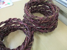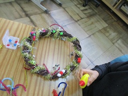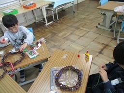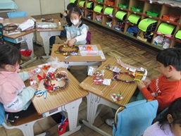 さつまいものつるを輪っかにして、クリスマスリースを作りました。モールやリボンをたくさん用意して、あさがおのリースよりも一回り大きなリースが出来上がりました。細かいビーズなどを1つ1つ丁寧につけて、集中して取り組んでいました。