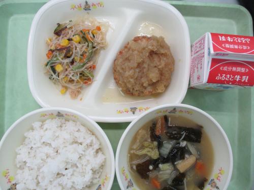 《こんだて》金芽米ごはん 牛乳 和風豆腐ハンバーグ 春雨サラダ 白菜とわかめのみそ汁 今日の給食は、和風豆腐ハンバーグのこんだてです。ハンバーグにかかっている大根おろしのソースには、すりおろしたりんごも入っていて、しょうゆ・酒・砂糖・みりんで味付けをしています。