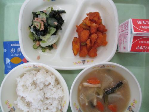 《こんだて》金芽米ごはん お魚ふりかけ 牛乳 鶏とさつま芋の揚げ煮 ツナとわかめのあえもの 大根のみそ汁