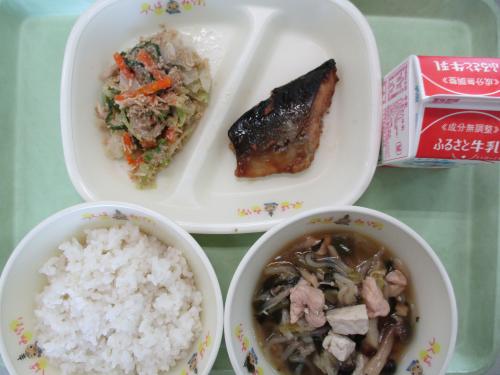 《こんだて》~国民スポーツ大会開催地・滋賀県の料理~ 金芽米ごはん 牛乳 ますの照り焼き ごま酢あえ じゅんじゅん 今日の給食は、9月28日(日)から10月8日(水)に滋賀県で開催されている国民スポーツ大会にちなんで、滋賀県の料理です。「じゅんじゅん」は牛肉・鶏肉・湖の魚などをすき焼き風に味付けをした鍋料理です。今日の給食では、鶏肉を使っています。