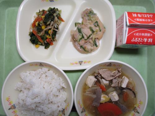 《こんだて》~茨城をたべようこんだて~ 金芽米ごはん 牛乳 鶏肉のねぎ塩焼き おかかあえ 豚汁 今週の給食は「茨城をたべようこんだて」です。「鶏肉のねぎ塩焼き」は、つくばみらい市産のねぎ・しょうが・にんにくと、塩・しょうゆなどの調味料を漬け込んで、焼いています。