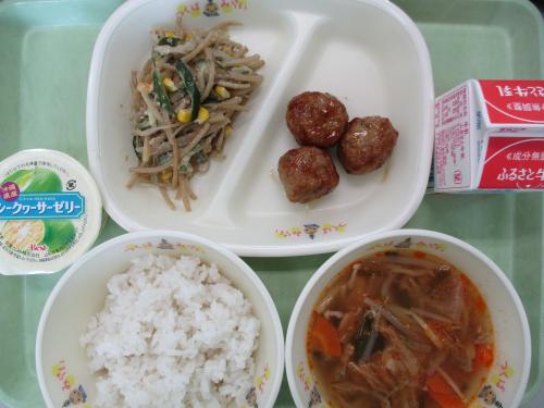 《こんだて》金芽米ごはん 牛乳 肉団子 ごぼうサラダ キムチスープ シークワーサーゼリー 今日の給食は、ごぼうサラダのこんだてです。ごぼうは、しょうゆ・砂糖・酢で炒り煮にしたものを冷まして、サラダにしています。