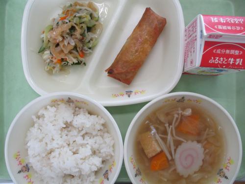 《こんだて》金芽米ごはん 牛乳 春巻き 中華くらげのあえもの 玉ねぎとえのきたけのスープ 毎月第3日曜日は「茨城をたべようDay」、第3日曜日からの1週間は「茨城をたべようWeek」です。給食中の放送では、今月の給食で使っているつくばみらい市産の食材の紹介がありました。