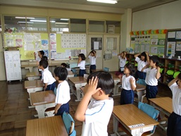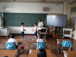 A、b、C・・・と、アルファベットを復習したあとは、友達とペアになって、短いあいさつでコミュニケーションを図りました。お手本の児童は、自信をもって発表していました。