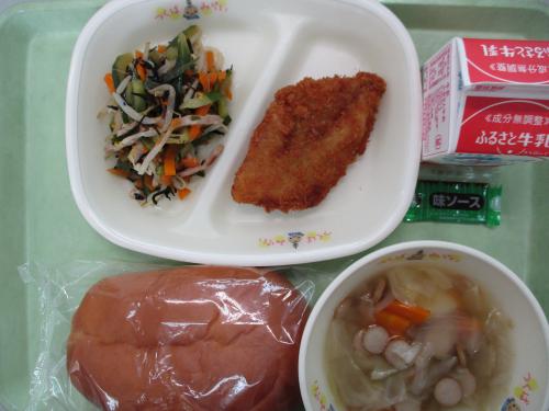 《こんだて》ミルクパン 牛乳 白身魚フライ(パックソース) ひじきのマリネ ポトフ 今日の給食は、ミルクパンのこんだてです。コッペパンよりも脱脂粉乳が多く練り込まれていて、ふんわりしています。