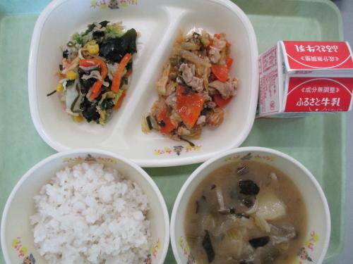 《こんだて》金芽米ごはん 牛乳 豚キムチ炒め 切り干し大根と海藻のサラダ じゃが芋とほうれん草のみそ汁 今日の給食は、豚キムチ炒めのこんだてです。ごはんがすすむ味付けで、おいしそうに食べていました。