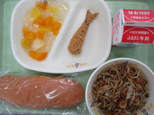 《こんだて》コッペパン 牛乳 いわしカリカリフライ フルーツゼリー 焼きそば 今日の給食は、焼きそばのこんだてです。久しぶりの焼きそばを、うれしそうに食べていました。