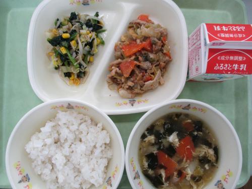 《こんだて》金芽米ごはん 牛乳 豚肉のねぎみそ炒め もやしとじゃこのサラダ(和風ごまドレッシング) かきたま汁 今日の給食は、かきたま汁のこんだてです。使っている卵は茨城県産です。茨城県では養鶏も盛んに行われています。