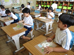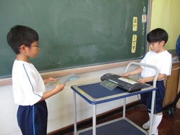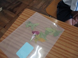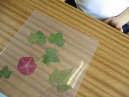 先週作ったあさがおの押し花で、下敷きを作りました。ラミネート加工機を使って、出てきた下敷きを見て、思わず歓声があがりました。