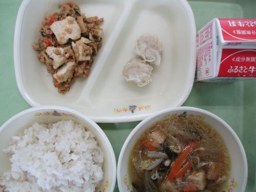 《こんだて》金芽米ごはん 牛乳 えびしゅうまい マーボー豆腐 チンゲンサイともやしのスープ 今日の給食は、チンゲンサイともやしのスープのこんだてです。茨城県は、日本一のチンゲンサイの産地です。今日の給食のように、中華料理でよく使われています。