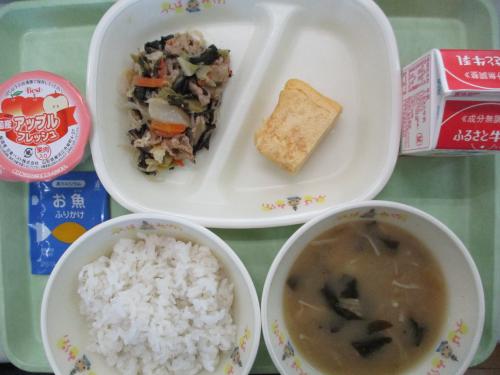 《こんだて》金芽米ごはん ふりかけ 牛乳 厚焼きたまご 野菜炒め じゃが芋のみそ汁 りんごゼリー 今日の給食は、じゃが芋のみそ汁のこんだてです。給食のみそ汁のだしは、かつおの厚削り節を煮出してとっただし汁と、煮干しの粉です。煮干しは骨ごと粉になっているので、うま味だけでなく、カルシウム源にもなります。