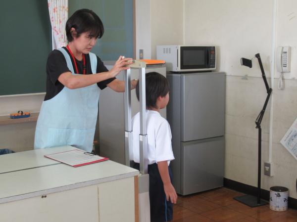 先週から、身体測定と救命教育を行っています。 9月9日「救急の日」に合わせて、けがの手当ての仕方や、突然人が倒れたらどうすればいいか、対応の方法を学びました。その後、身長・体重を計測しました。