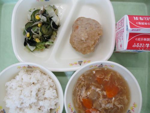 《こんだて》金芽米ごはん 牛乳 和風ハンバーグ キャベツとじゃこのサラダ(和風ごまドレッシング) かきたま汁 今日の給食は、かきたま汁のこんだてです。茨城県産の卵を使っています。