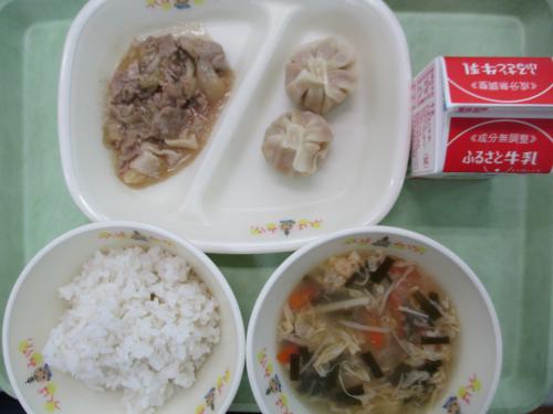 《こんだて》金芽米ごはん 牛乳 ショーロンポー 豚肉のしょうがレモン炒め にら玉汁 今日の給食は、豚肉のしょうがレモン炒めのこんだてです。レモンの風味が加わることで、減塩でもおいしく仕上がります。レシピは、つくばみらい市公式クックパッドをごらんください。