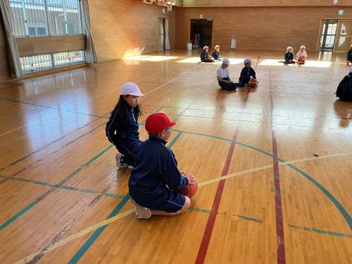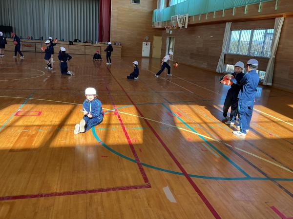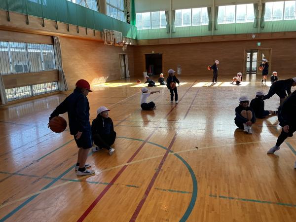 縄跳びの後、バスケットボールをしました。ハンドリングの練習をしてボールになれたり、ドリブル鬼ごっこを楽しんだりしました。