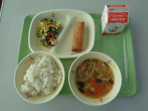 《こんだて》金芽米ごはん 牛乳 はるまき こまつなとささみのサラダ 鶏肉と野菜のフォー 今日の給食は、「鶏肉と野菜のフォー」です。フォーは米粉で作られた平たいめんと牛肉や鶏肉からとったあっさりスープをあわせたベトナム料理です。