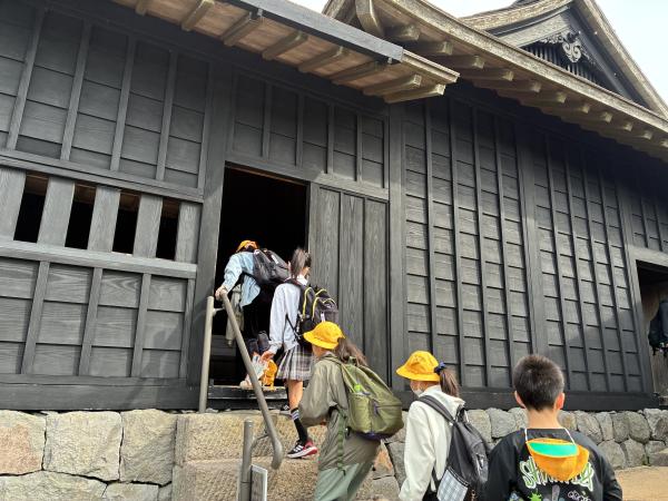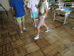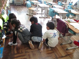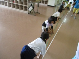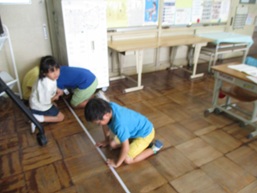 子供たちが気になっていた、教室のたてと横の長さは、どちらが長いのだろう?という問いを課題に、取り組みました。紙テープを使う方法と、床のマス目を使う方法とで、比べました。