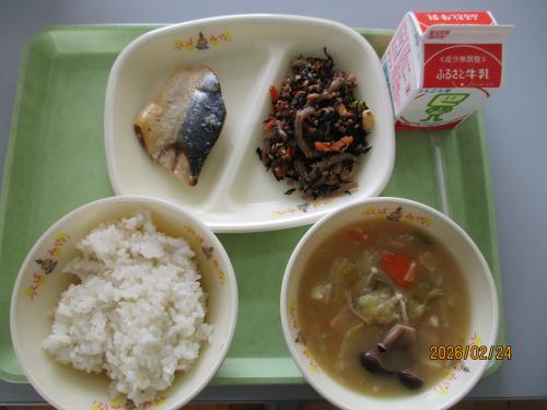 《こんだて》金芽米ごはん 牛乳 さばの塩麹焼き ひじきと大豆の煮物 キャベツのみそ汁 今日の煮物に入っているひじきには、骨をじょうぶにするカルシウムや、貧血を予防する鉄、腸の働きをよくする食物繊維などがたくさん含まれています。栄養と旨味がたっぷりで、ごはんによく合います。