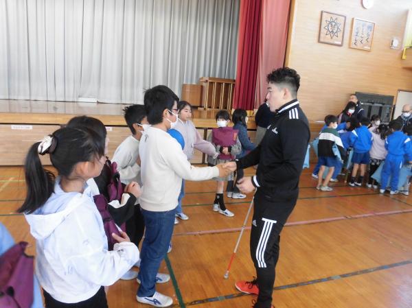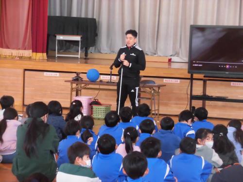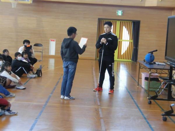 今日は、東京パラリンピック(ゴールボール)に日本代表として出場経験もある山口凌河選手(取手市出身)に来校いただき、全児童向けに講演会、そして4~6年生向けに体験会を行っていただきました。