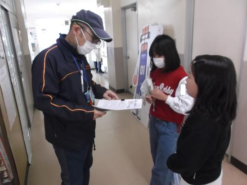 集会委員が各学年の担任の先生に「楽しい福岡小学校にしよう!メッセージ集会」のメッセージ作成依頼を行っている様子です。担任の先生からの質問に丁寧に答えるなど、立派な態度でした。
