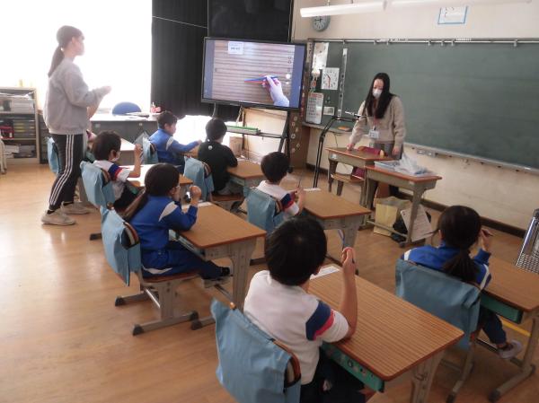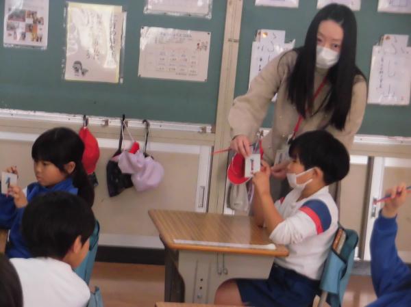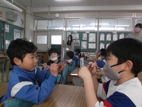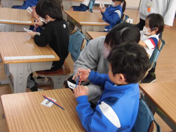 1年生が栄養教諭に正しいお箸の使い方を教えていただきました。「おはし名人」になるために、よく話を聞いて練習していました。