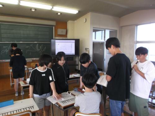 6年生が一人ずつ「メヌエット」という曲のリコーダーのテストをしていました。別室でグループ練習している児童もいました。