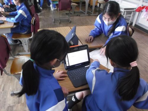 学習した内容をスライドにまとめ、2年生に発表する準備をしているところです。より分かりやすく伝えるために、どのように工夫すればよいか熱心に話し合っていました。
