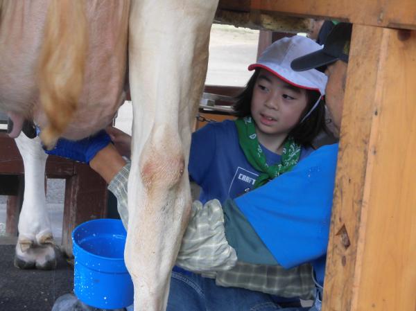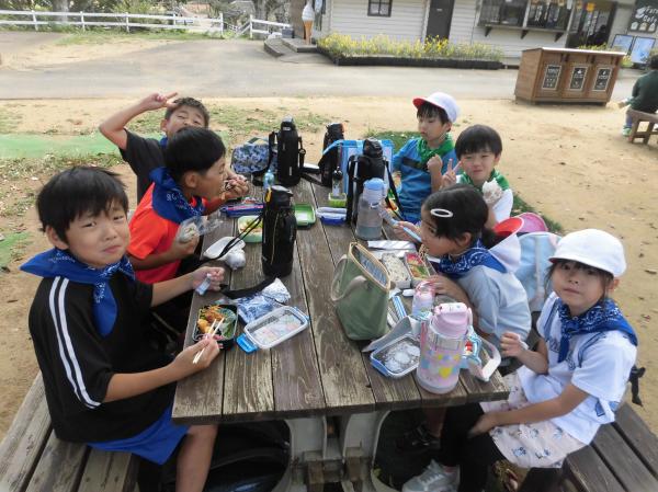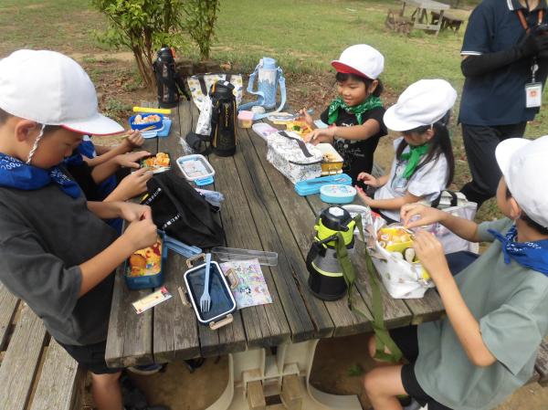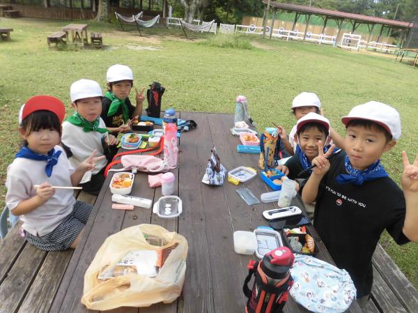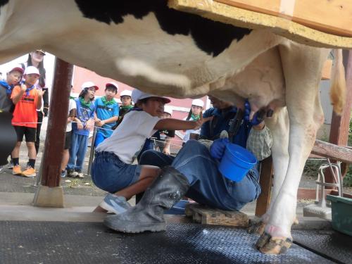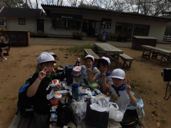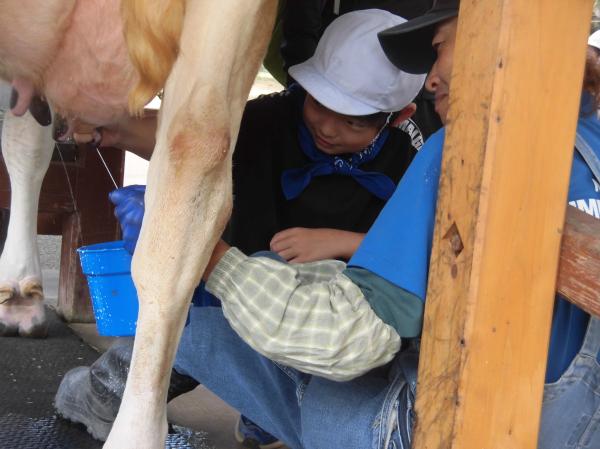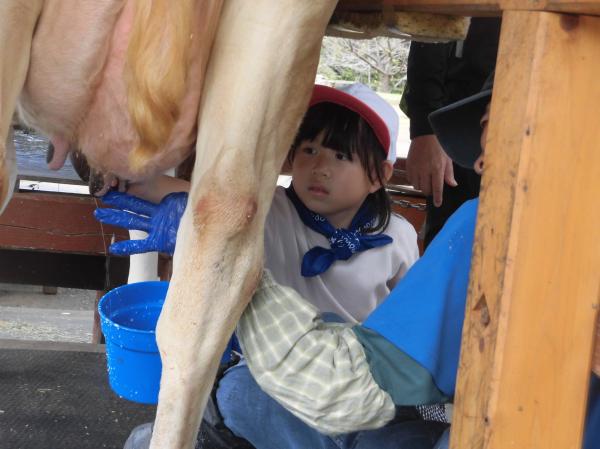 全員が一人ずつ、牛「みすずちゃん」の乳しぼり体験をしました。 そして、みんなお待ちかね、お弁当&お菓子タイムです。