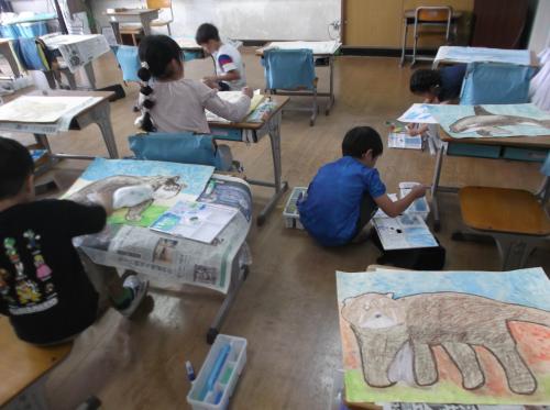 全学年、市展、そして県展への出品に向けて作品づくりに励んでいます。2年生は図画工作科の時間に「どうぶつさんといっしょに」という単元の作品づくりに熱心に取り組んでいました。