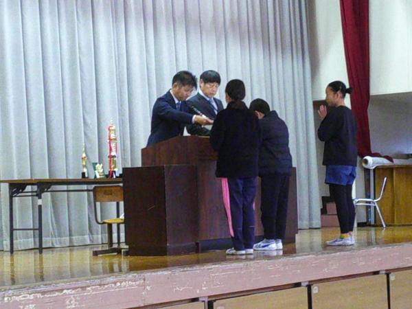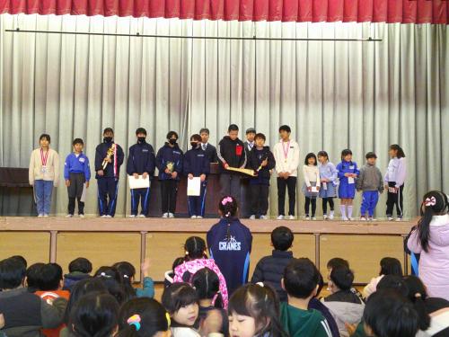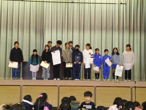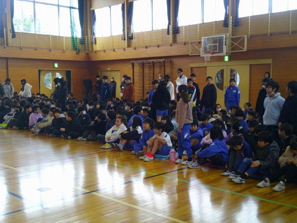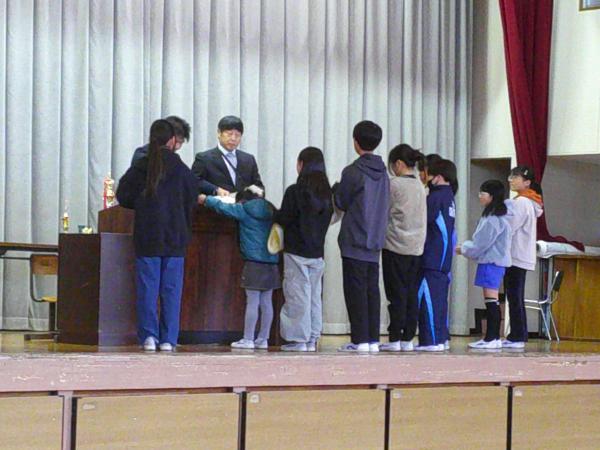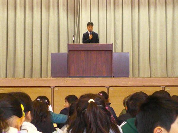続いて、校長先生の話では、あいさつ・やさしさ・黙働清掃についてとっても頑張った話があり、その後には生徒指導主事の先生から、冬休みの生活についての話がありました。明日からの冬休みは、事故や事件に巻き込まれることなく、安心・安全な生活を送ってほしいと思います。子どもたちの表情は待ちに待った冬休み!といった雰囲気が感じられました。