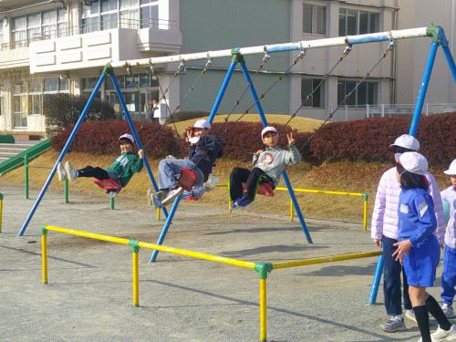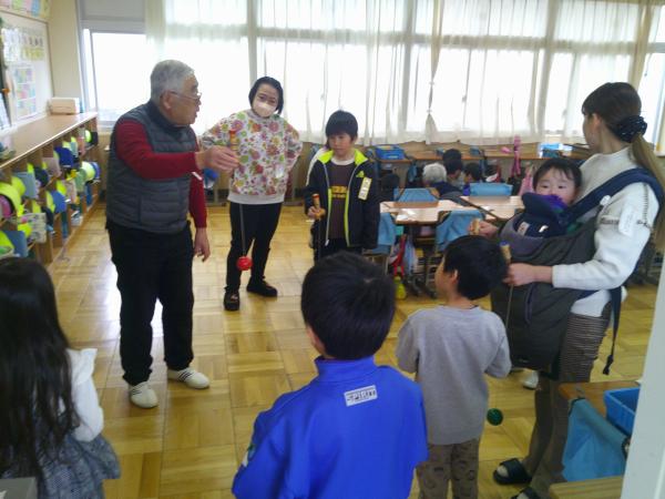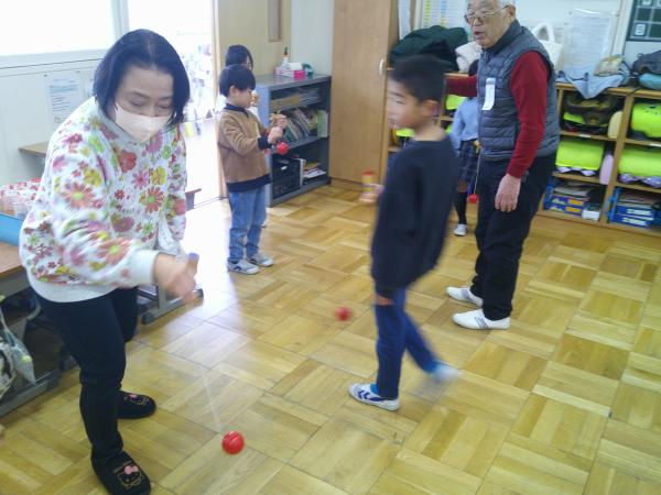 コマや竹トンボ、あやとり、けん玉、竹馬、羽根つき、おはじきなどいろいろな遊びを楽しむことができたようです。初めての遊びで最初はなかなかうまくできなかった遊びも少しずつ慣れてきて、みんなで楽しむことができました。