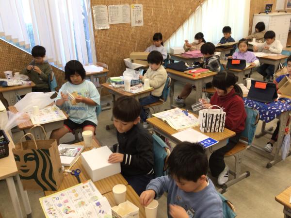 2年生の生活科では、動くおもちゃ作りをしています。 計画書を見ながら、どうすれば動くのかを自分で考えて取り組んでいます。 もっと動くにはどうすればよいのか、工夫したり、友達のアドバイスを聞いたりして作っています。 完成が楽しみです。