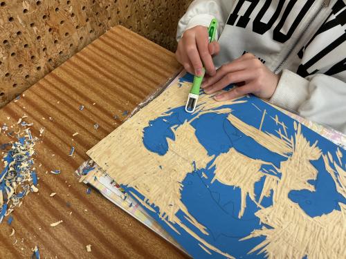 図工の時間に掘り進み版画に取り組んでいます。 様々な色を重ねた創意工夫が詰まった素敵な作品が出来上がっています。