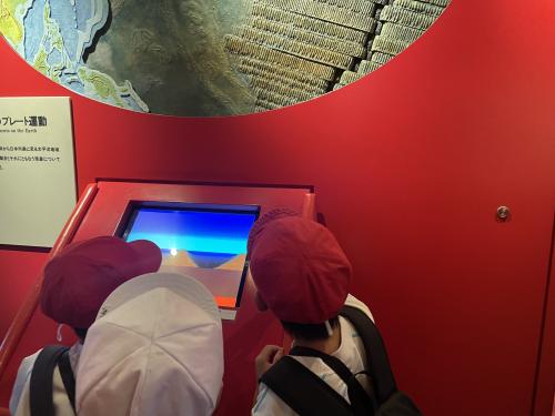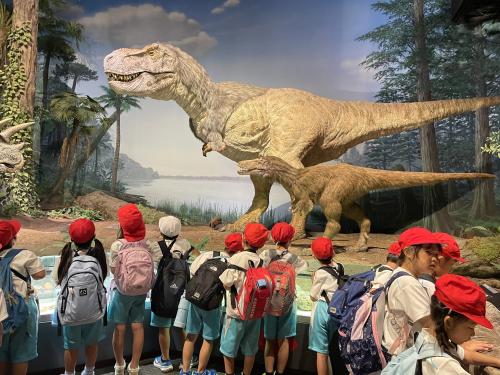 ミュージアムパークでは、大きな恐竜にびっくりしています。