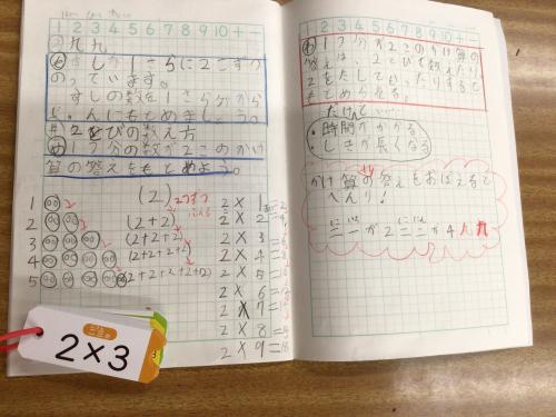2年生の算数は、いよいよかけ算に入りました。 文章題を図に表したり、式に表したりと、どんどん力をつけています。 かけ算検定もあるので、がんばっていきたいと思います。