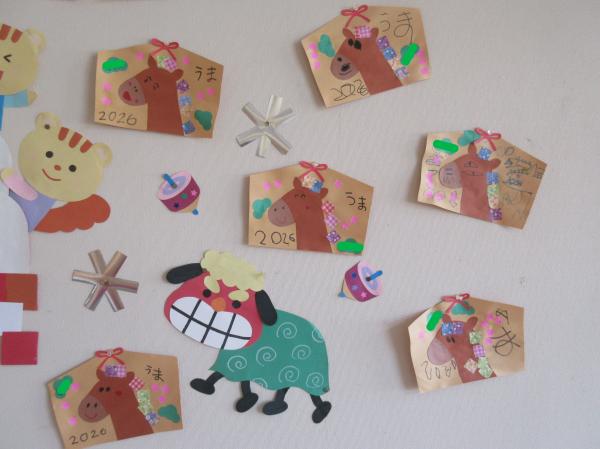 明日から、幼稚園が始まります!先生たちは、研修や話し合い、保育準備などをしました。壁面や遊びのコーナーが『お正月』になっています♪