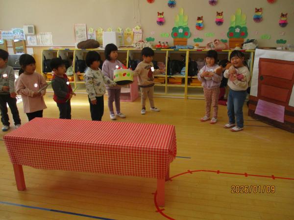年中さんは、生活発表会の練習に励んでいます✨年少さんが劇の練習を見に来てくれました😉たくさんのお友達を前に、緊張している様子もみられましたが、大きい声で演じることができていました💗