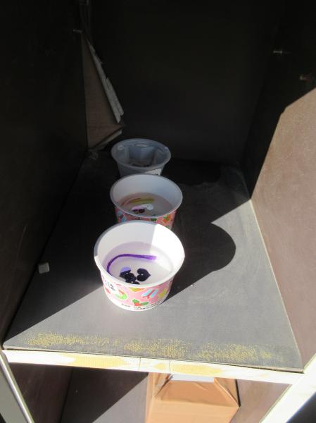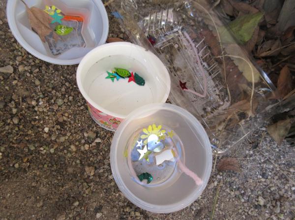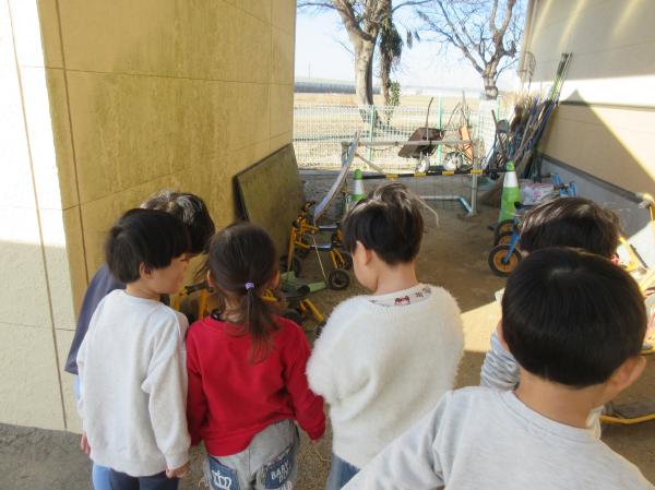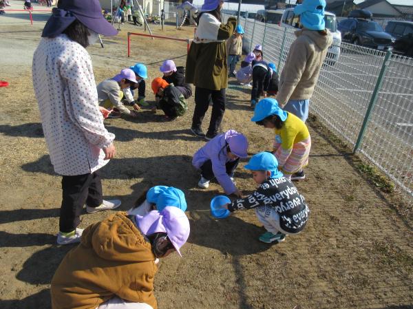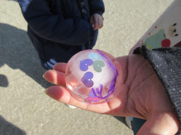 その後は、氷づくりで、先週園庭に置いておいた水の入ったカップが凍っているかをみんなで見てみました❄