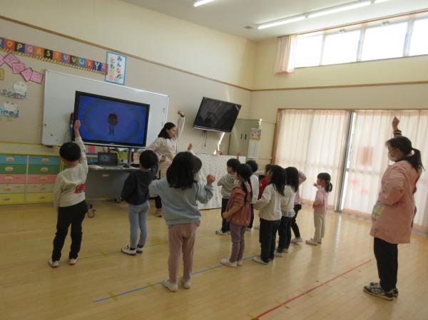 年長さんは、英語教室自由参観1日目がありました。今日は、お家の方と宮崎県日向市の教育長さんをはじめとしたお客様も来園し、たくさんのお客様を前に、ちょっぴりドキドキしていたつき組さんでしたが、レッスンが始まると普段どおり元気いっぱい、自信をもって英語を楽しむことができました。
