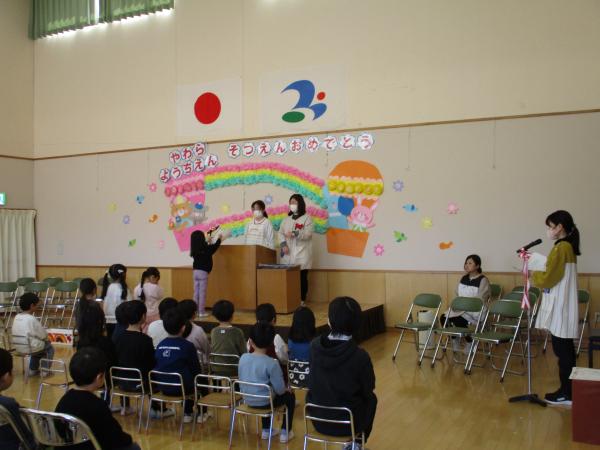 今日は卒園式の予行を行いました。年少・年中さんが見学する前で、ちょっぴり緊張した年長さんですが、今までの練習を生かして頑張っていました。