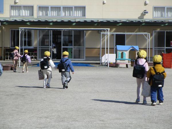 今回は保育室からの避難ではなく、年少組が多目的ホール、年中組が園庭、年長組が遊戯室からの避難をしました😊